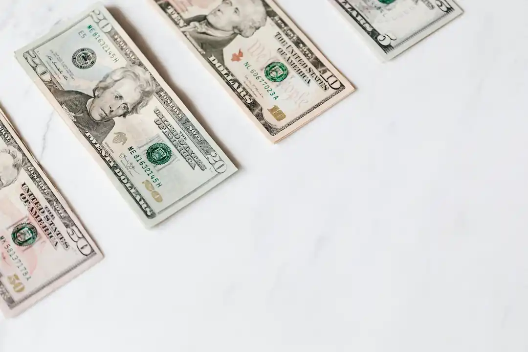 不同面額的美金鈔票整齊地排列在白色桌面上。