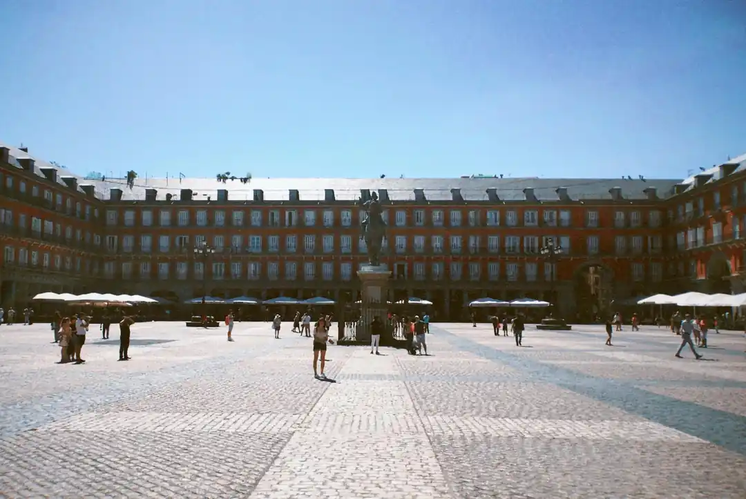 從太陽門廣場,隨意鑽進一條巷子,很快就能走到氣勢恢宏的主廣場(Plaza Mayor)。這座四四方方的廣場,被一圈精美的紅色建築環繞,過去曾是鬥牛、審判甚至皇室婚禮的場所,如今則是街頭藝人、露天咖啡座和遊客的天下。我特別喜歡在傍晚時分來到這裡,點一杯沁涼的 Sangria,看著廣場中央腓力三世的騎馬雕像在夕陽下被染成金色,周圍的建築亮起溫暖的燈光,那種氛圍,真的會讓人忘卻時間。