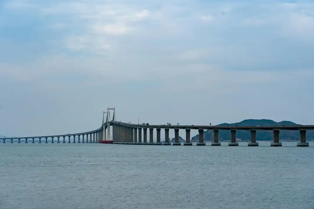 伊良部大橋橫跨在藍色海洋之上,遠方是多雲的天空。